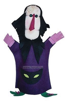 Magyarországon előállított, többnyire magyar alapanyagokból, kézi munkával készített, magas minőségű termék, mely kimondottan pedagógia módszertani szempontok alapján lett kialakítva. Felnőtt kézre méretezve, így kiválóan alkalmas az anyanyelvi vagy zenés foglalkozások színesítésére, kiegészítésére. A boszorkány kesztyűbáb 25-30 cm nagyságú, ötujjas báb. Ruhája sötétlila, fekete macska díszítéssel. Csizmája sötétzöld, kendője fekete. Arca gyermekek számára is mókás, hosszú piros orral és kis méretű zöld szemekkel. Haja fehér színű fonalból készült. Kezei világoslilák. A mesékben megjelenő boszorkányos karakterleírásoknak megfelel, mégsem ad rémísztő összképet.