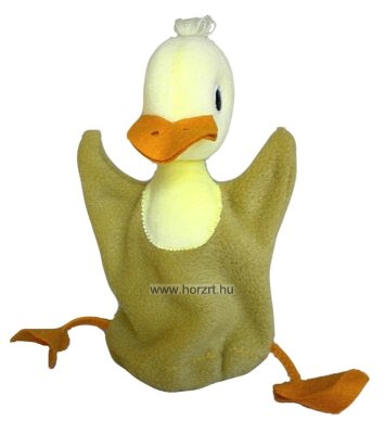 Magyarországon előállított, többnyire magyar alapanyagokból, kézi munkával készített, magas minőségű termék, mely kimondottan pedagógia módszertani szempontok alapján lett kialakítva. Felnőtt kézre méretezve, így kiválóan alkalmas az anyanyelvi vagy zenés foglalkozások színesítésére. A kacsa kesztyűbáb 25-30 cm nagyságú, három ujjas, puha textil anyagból készült báb. Testrésze citromsárga polár anyag, mellkasán kis fehér mellény található. Feje citromsárga, kis fonal bóbitával és fekete gombszemekkel. Nagy lapos narancssárga filc csőre és lábai hűen adják vissza az állat jellegzetes vonásait. Kedves megjelenése miatt könnyen beleilleszthető bármilyen foglalkozásba.