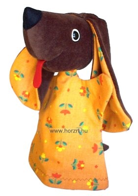 Magyarországon előállított, többnyire magyar alapanyagokból, kézi munkával készített, magas minőségű termék, mely kimondottan pedagógia módszertani szempontok alapján lett kialakítva. Felnőtt kézre méretezve, így kiválóan alkalmas az anyanyelvi vagy zenés foglalkozások színesítésére, kiegészítésére. A kutya kesztyűbáb 25-30 cm nagyságú, három ujjas, puha textil anyagból készült báb. Teste aprómintás vászon. Feje és fülei sötétbarna polár anyag, kilógó nyelve piros filc. Fülei bélése szintén aprómintás vászon. Hosszú orrának filc hegye és gombszemei fekete színűek. Vidám mintájú teste és mosolygós arckifejezése miatt egy igazi színfoltja lehet a foglalkozásoknak.