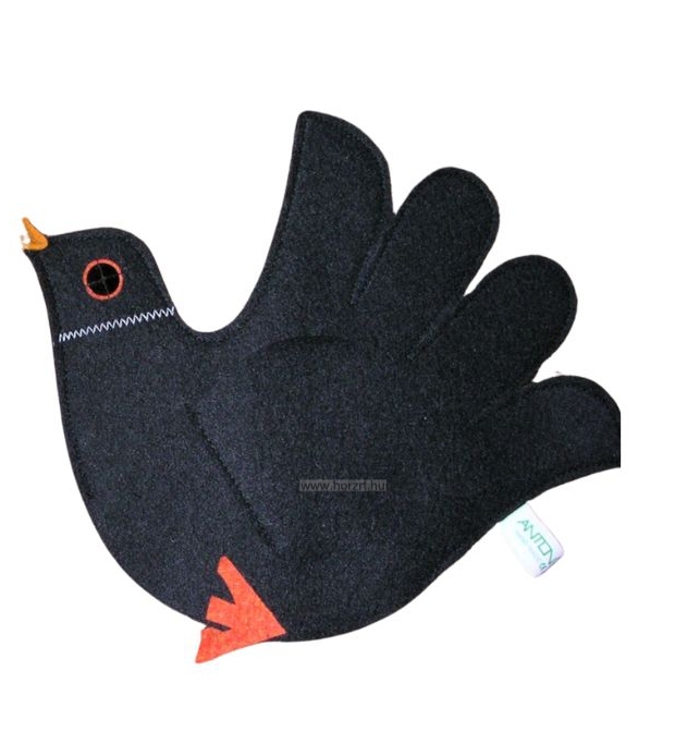 Magyarországon előállított, többnyire magyar alapanyagokból, kézi munkával készített, magas minőségű termék, mely kimondottan pedagógia módszertani szempontok alapján lett kialakítva. Felnőtt kézre méretezve, így kiválóan alkalmas az anyanyelvi vagy zenés foglalkozások színesítésére, kiegészítésére. A madárka kesztyűbáb 25-30 cm nagyságú, egykezes, puha filc anyagból készült báb. Teste és szárnyai fekete vagy kék színűek. Nyakrészét világos varrás díszíti. Kis méretű csőre citromsárga, lábai narancssárgák, szemei sötétnarancs filcből készültek, fekete flitterrel. Farktollainak kialakítása miatt kényelmes bábozást tesz lehetővé.