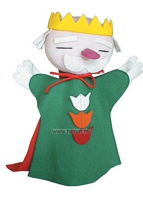 Magyarországon előállított, többnyire magyar alapanyagokból, kézi munkával készített, magas minőségű termék, mely kimondottan pedagógia módszertani szempontok alapján lett kialakítva. Felnőtt kézre méretezve, így kiválóan alkalmas az anyanyelvi vagy zenés foglalkozások színesítésére, kiegészítésére. Az öreg király kesztyűbáb 25-30 cm nagyságú, három ujjas, puha textil anyagból készült báb. Teste zöld színű polár anyag, 3 színű filc tulipán díszítéssel. Királyos megjelenését lila polár palástja és citromsárga filc koronája erősíti. Feje rózsaszínű plüss anyag, kezei, bajsza, haja és szemöldöke fehér filc. Orra nagy méretű, sötétrózsaszín szín filc. Arckifejezése nyugodtságot tükröz. Megjelenése miatt könnyen beilleszthető bármilyen foglalkozásba.