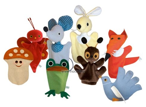 Tartalma: 7 db kesztyűbáb, pillangó, egér, nyuszi, madárka, róka, gomba, béka és hangya kesztyűbáb gyermekkézre. 4 éves kortól.