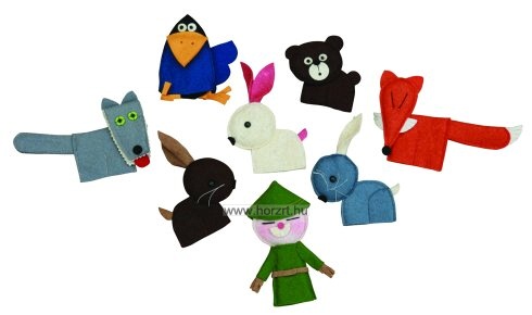 A három nyúl ujjbábkészlet tartalma 8 db ujjbáb: három nyúl, varjú, róka, farkas, medve és vadász. Az ujjbábok mérete általánosságban kb. 12,5 cm.