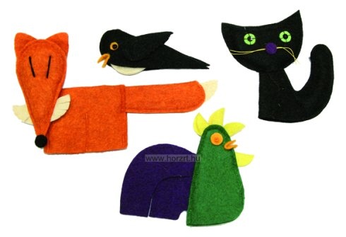Az aranytarajos kiskakas ujjbábkészlet tartalma 4 db ujjbáb: cica, fecske, róka és kakas. Az ujjbábok mérete általánosságban kb. 12,5 cm.