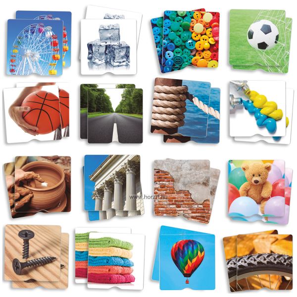 A 34 db kártya 17 féle textúrájú és tapintású felülettel rendelkezik. A gyerekek anyag felismerését segíti a változatosan összeállított doboz. Nehezíti a feladatot, hogy a mintákat bekötött szemmel kell összepárosítani, szétválogatni.