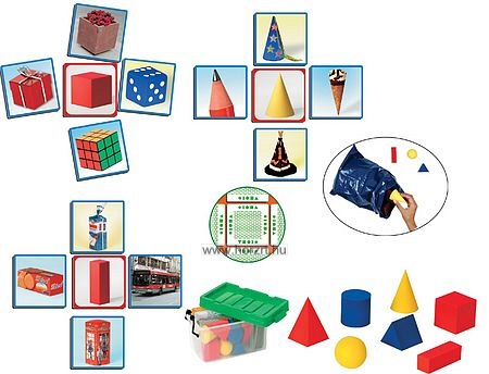 Párosítsuk össze a geometriai testeket a hasonló formájú mindennapi tárgyak képeivel! A kártyák hátoldalán ellenőrizhetjük a helyes megoldást.
