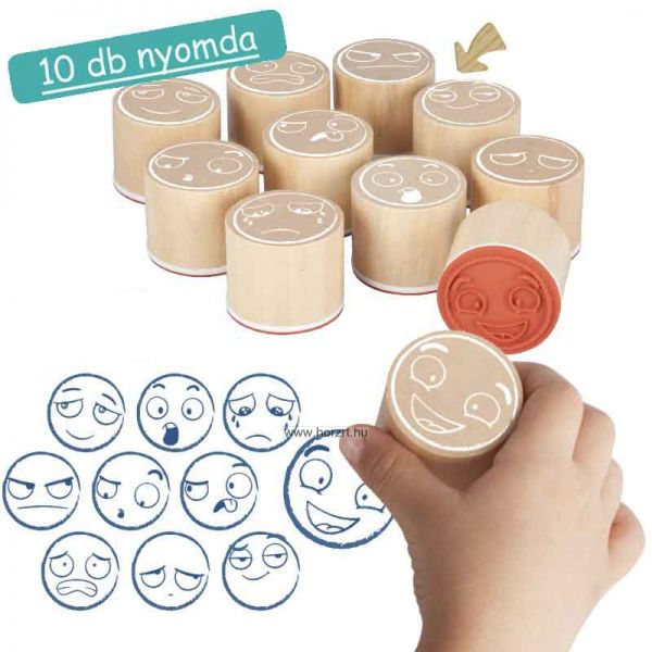 A készlet 10 tömör fából készült, jó minőségű, vastag maxi-nyomdát tartalmaz. A nyomdákon a 10 alap hangulatjel szerepel. Nyomda méretek: 4 cm átmérő és 3,5 cm vastagság.