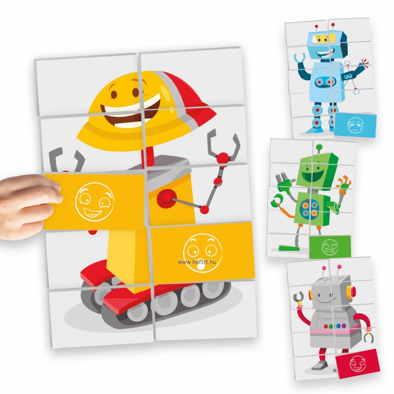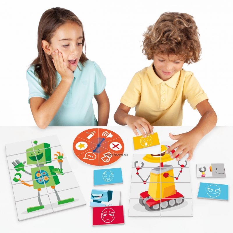 A játék 2 kereket és 40 kártyát tartalmaz, amelyek erős, nagyon strapabíró és kiváló minőségű vastag kartonból készülnek. A kártyák 4 robotot alkotnak, amelyek egyenként 10 darabból állnak, és a robot minden egyes darabjának hátulján található a tíz alapvető érzelem egyike, amely a viselkedésünket irányítja: boldogság, szomorúság, düh, meglepetés, undor, csodálat, félelem, kíváncsiság, biztonság és bűntudat.