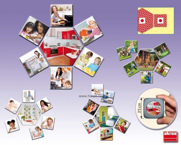 A kártyák segítségével a gyermekek be tudják azonosítani a különböző ház részeket, úgymint, konyha, nappali, fürdőszoba, hálószoba és a kert. Ezekhez pedig társítani tudják az egyes tevékenységeket, amik egy háztartásban előfordulnak!