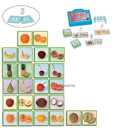 A gyümölcs egész és felezett képe, valamint illata kerül párosításra. A kártyák és a tégely alján levő szám azonossága a megoldás helyességét jelzi. Az eszköz alkalmas memóriajátékra és különböző csoportosításra is.