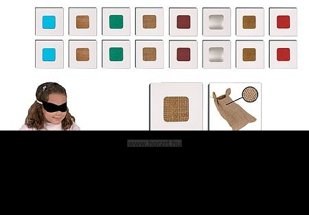 A különböző felületű kártyákat párosíthatjuk tapintással, vagy vizuálisan hozzárendelhetjük az azonos anyagból készült tárgyak képeit is. A memória fejlesztése mellett bővíti a gyerekek tudását a tárgyak anyagának megismertetésével. Önellenőrzés a hátoldalon.