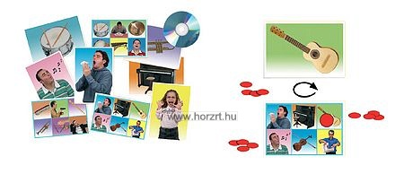 - hátoldalán hat kép hangszerekkel vagy cselekvésekkel