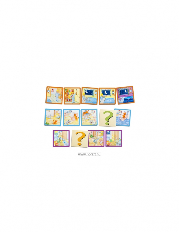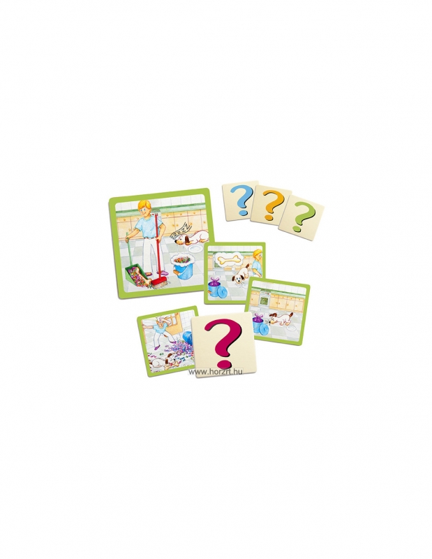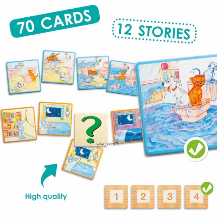 A játék 70 db képkártyát tartalmaz, amelyek összesen 12 db humoros és vicces történetet tartalmaznak. A képeket sorrendbe téve a gyermek elmesélheti, körülírhatja a képeket. Lehetőség vannak arra, hogy egy-egy kártyát kihagyjunk a képsorból, ez által a gyermek saját maga alakíthatja a történet alakulását.