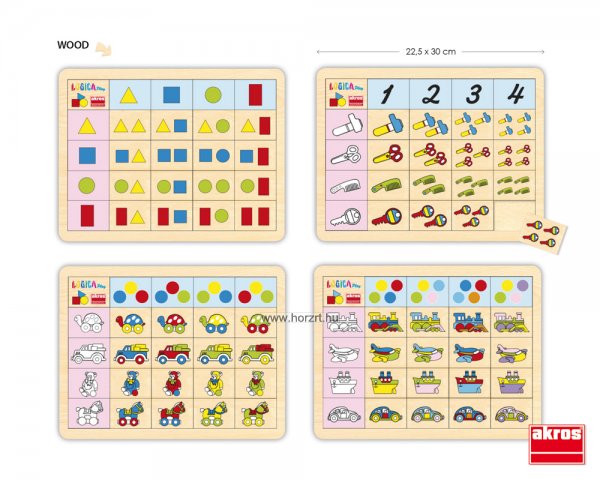 Mátrix-szerűen helyezzük a képeket az alaptáblán oda, ahol mindkét tényezőnek együttesen megfelelnek. Használatuk közben gyakorolhatjuk a térirányok megnevezését, a méretek szerinti osztályozást, színek, formák felismerését, egyeztetését.