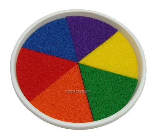 Sárga, zöld, narancssárga, piros, kék, lila színek vannak a festékpárnán.