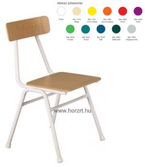 Elektrosztatikus porszórással festett. Acélcső vázszerkezet átmérője: 18 mm. Ülőke és támla: lakkozott, idom-préselt réteglemez. Lábak végén műanyag végzáró dugó. Rakásolható.
