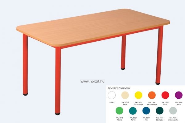 Az óvodák és bölcsődék számára gyártott fémvázas Emese óvodai asztal (bölcsődei asztal) elektrosztatikus porszórással festett 40 mm átmérőjű acélcső vázszerkezettel, 18 mm vastag laminált asztallappal, ABS élzárással, lábak végén műanyag végzáró dugóval készül.