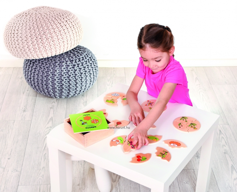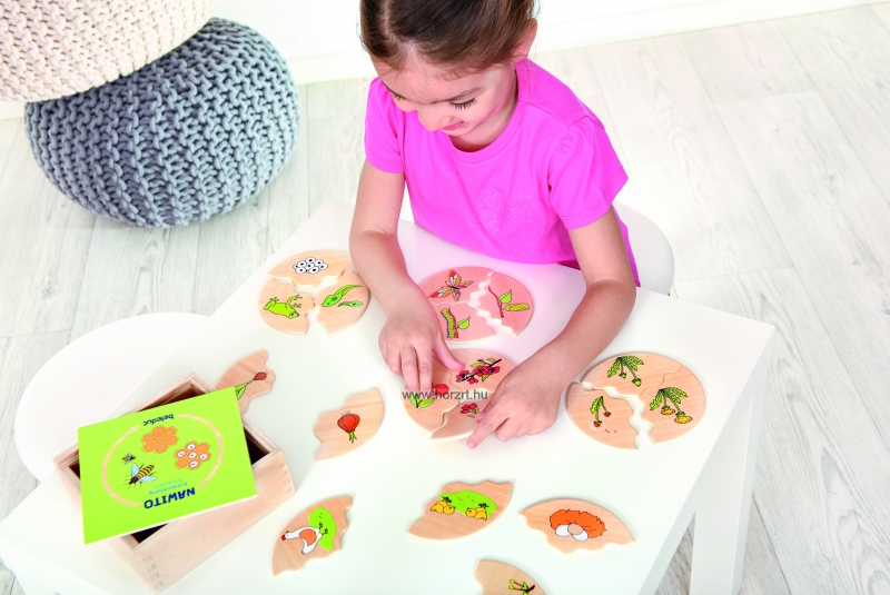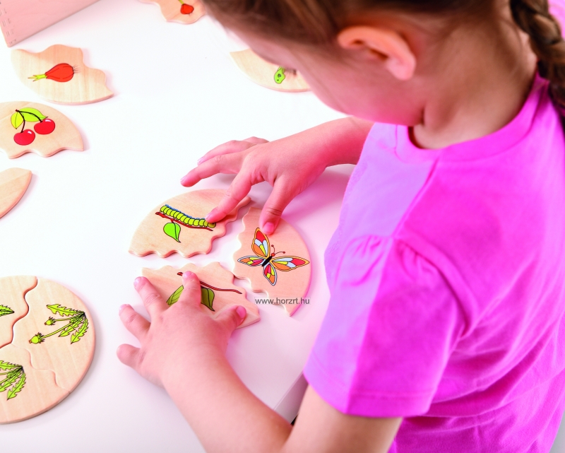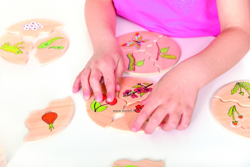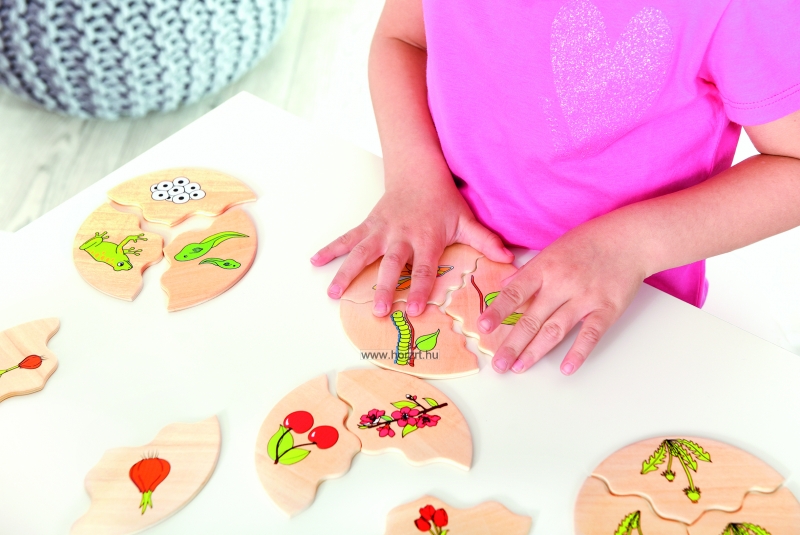 A fa puzzle segítségével a gyerekek megismerkednek a természetben előforduló különböző fejlődési szakaszokkal.