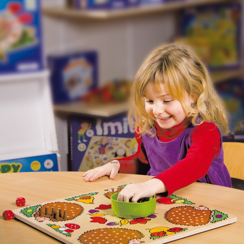 Az egyszerű szabályjáték segítségével a gyermekek megismerkednek a számképekkel és a számokkal. A két dobókocka lehetőséget nyújt a tízes számkör átlépésére is.