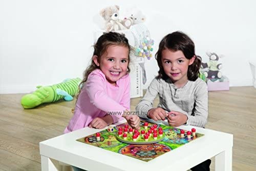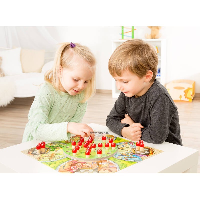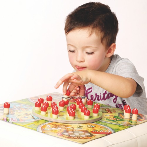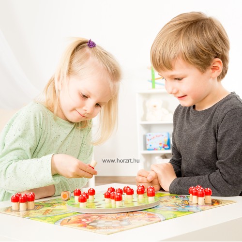 28 db gomba figura, 1 db szín dobókocka, 1 db alaptálba(37x37 cm), 1 db forgató tábla