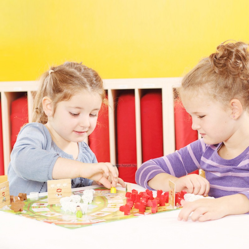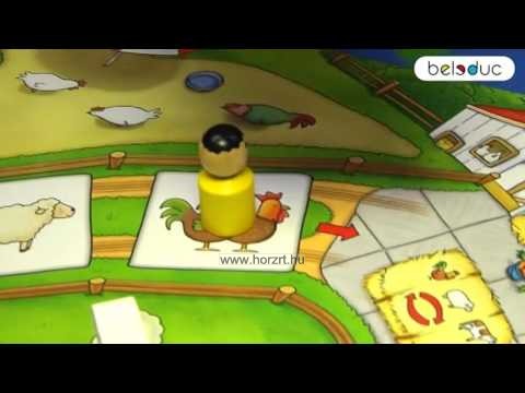 Tegyük a táblát az asztalra, majd helyezzük rá a bábukat… tyúkokat, bárányokat, teheneket és a traktort értelemszerűen mindet a saját helyére.