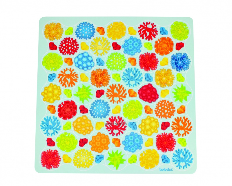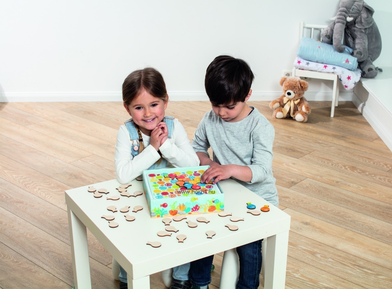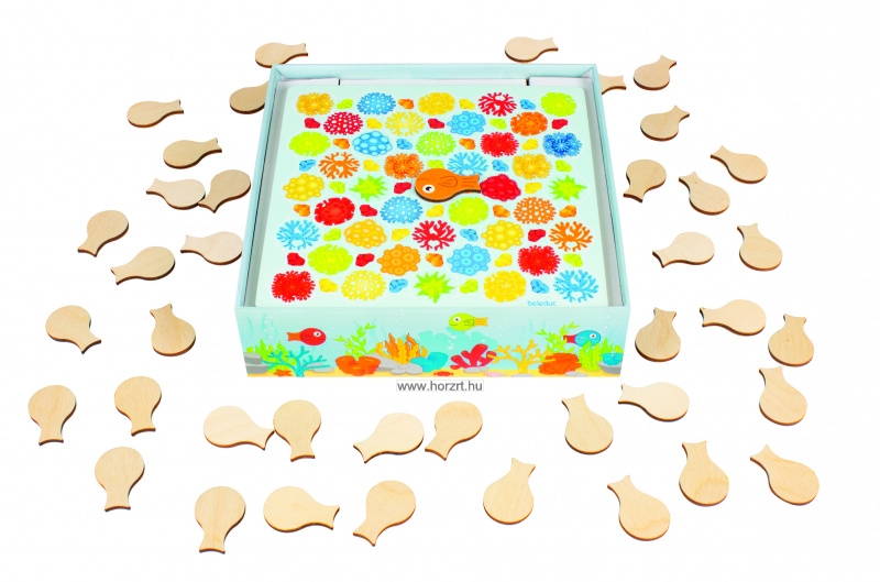 Helyezzük a játéktáblát (korallzátony) az asztal közepére, és tegyük az egyszínű narancssárga halat a korall közepén lévő megfelelő mezőre. A többi halat keverjük össze és a színes oldalukat lefelé fordítva terítsük szét őket az asztalon.