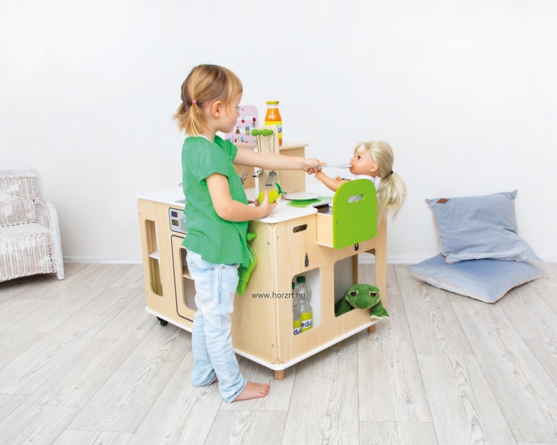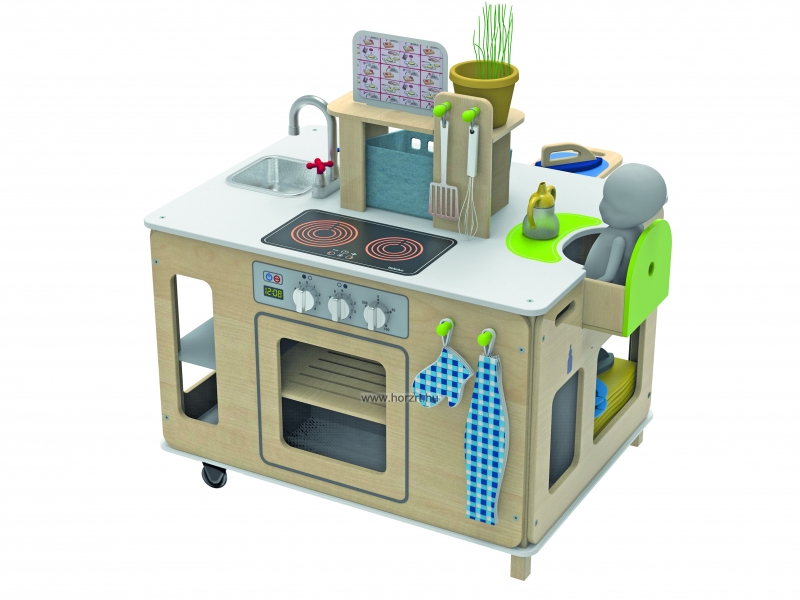 A főzés, mosogatás, vasalás és még sok más tevékenység végezhető el az új mobil konyhai központban! Minden oldalon van valami felfedezni való: főzősarok, forró lapokkal és sütővel, valamint különböző receptkártyákkal, kihúzható etetőszék, amiben a gyerekek gondoskodhatnak a babáról, vasaló és mosogatósarok, vasalódeszkával, mosogatóval és szemetesládával a rend fenntartásához.
