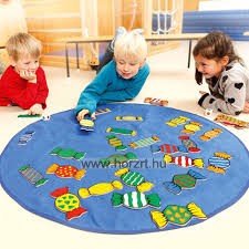 A cukorkákat keverjük össze és szórjuk szét őket a padlón a színes oldalukkal felfelé. A dobókockákat tegyük a cukorkák mellé.