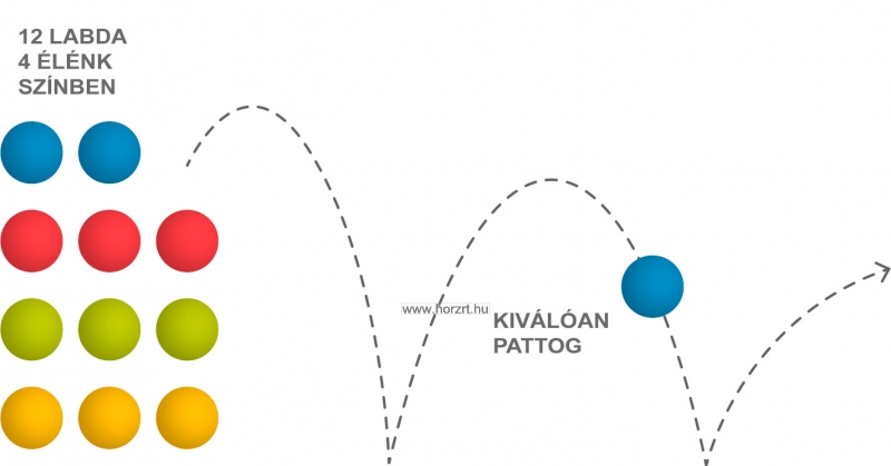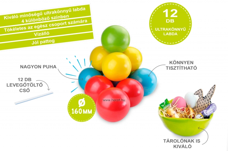 12 db ultrakönnyű labda 4 különböző színben (3 piros, 3 kék, 3 zöld, 3 sárga), 12 db levegőfeltöltő csővel.