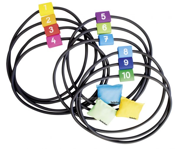 A tíz darab színes karikát bármilyen formában elhelyezhetünk és sok változatban használhatjuk.