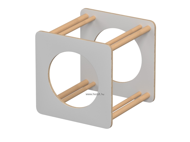 A kocka két oldalán kör alakú nyílások találhatók, míg a másik két oldalán 2x2 pár rúd biztosítja a mászáshoz szükséges támaszt. Ez a kialakítás különféle mozgásformák gyakorlására ad lehetőséget, miközben támogatja a gyermekek motorikus készségeinek és koordinációjának fejlődését.