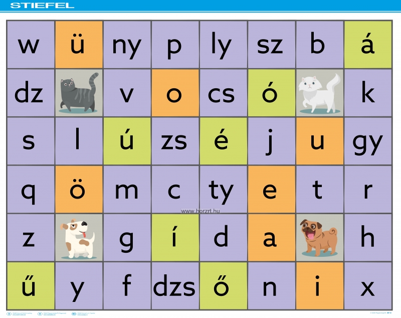 Nyomtatott kisbetű Bee-Bot gyakorlópálya – a magán- és mássalhangzók megkülönböztetésén túl a rövid és hosszú magánhangzókat is különböző színnel jelöltük.
