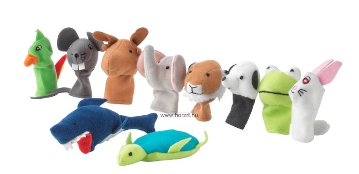 10 db ujjbáb: papagáj, egér, ló, elefánt, oroszlán, kutyus, béka, nyuszi, cápa, teknős.