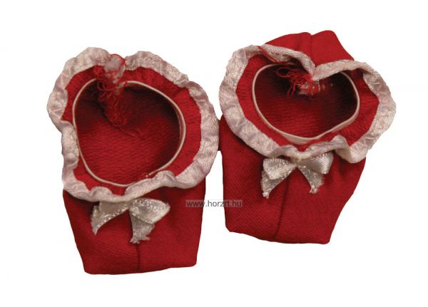 A pici játékcipő textil anyagból készült, kedves masnival a tetején.