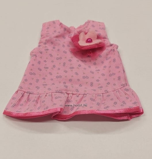 24-33 cm méretű játékbabára való ruha, rózsaszín alapon kék virágmintás, nagy rózsaszín, rávarrt virággal díszített ujjatlan ruhácska. A manufakturális gyártásból adódóan előfordulhat, hogy a ruhák színe eltérhet a képen láthatótól.