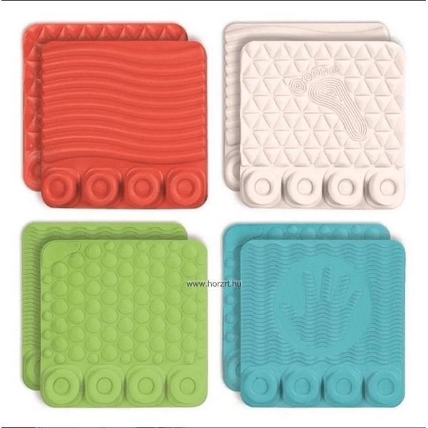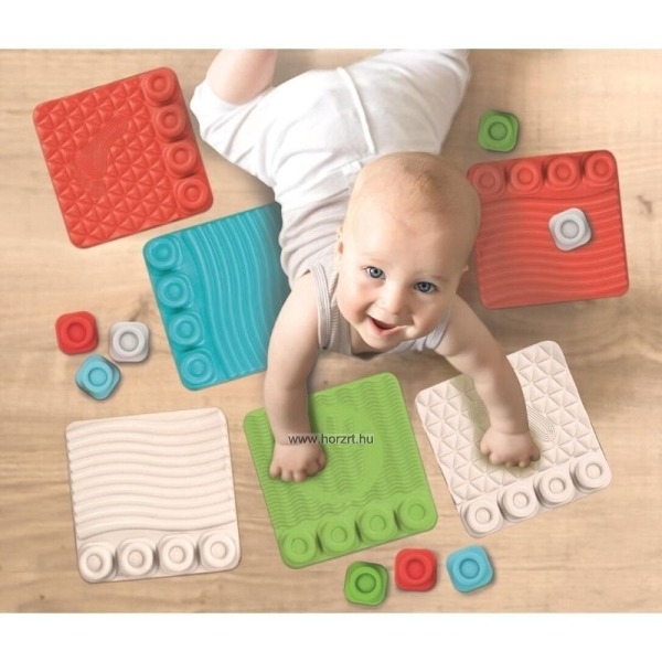 8 darab puha szőnyeglap található a csomagban, melyeken különböző textúrák és kiemelkedések találhatóak.
