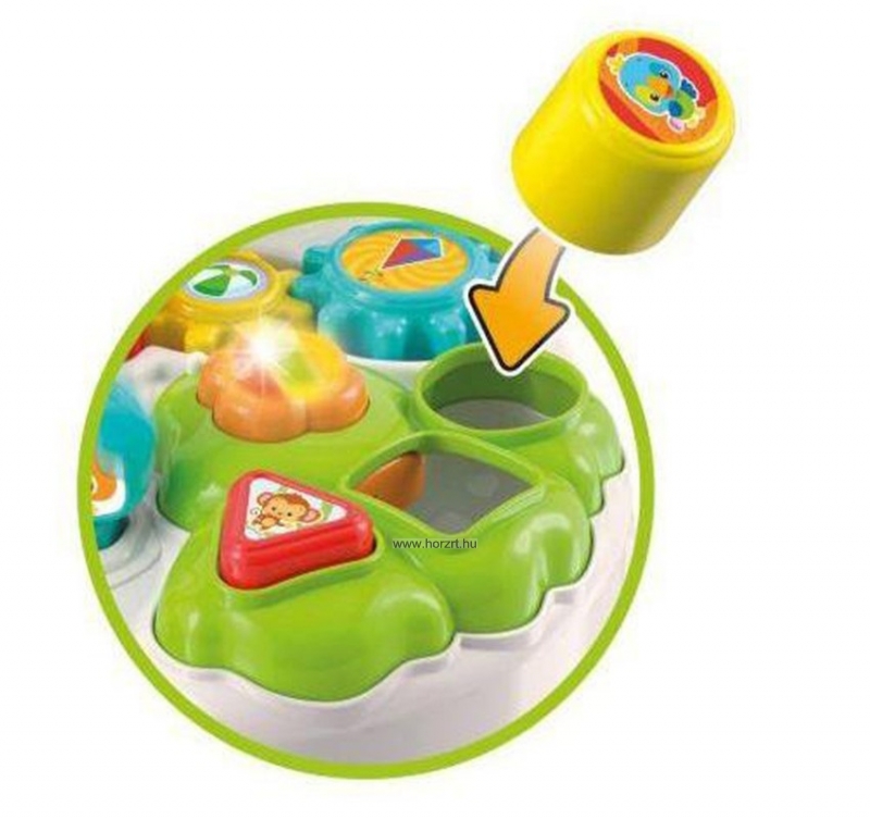 Interaktív elektronikus tanulóasztal, amely rengeteg élményt tartogat a gyerekek számára, hisz: a formák területe világít és hangokat ad ki, a fogaskerekek körbe-körbe forognak, a gombok megnyomáskor mozognak.