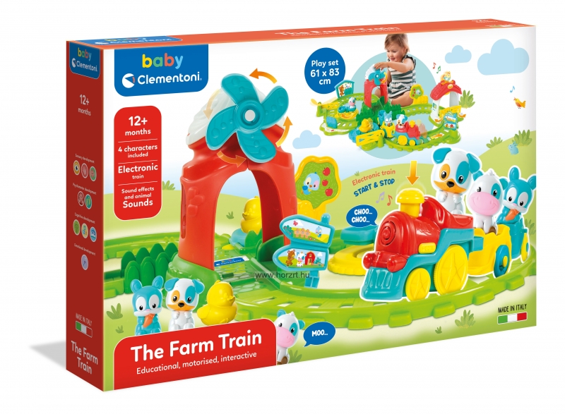 Interaktív játékkészlet egy motoros vonattal, amely körbejárja a farmot, különböző hangokat és valósághű hanghatásokat keltve.