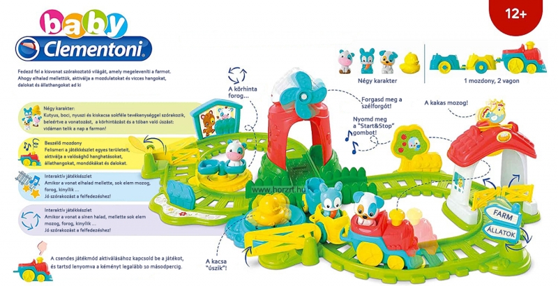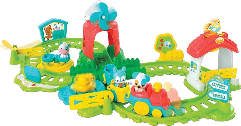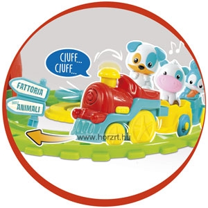 Tartalma: 1 db beszélő mozdony két kocsival, 4 tündéri kisállat: kacsa, kutyus, boci, nyuszi. A játéktér összeszereléséhez különböző jópofa elem (pl. sín, kapu, szélkakas, sorompó, a kiskacsának tó... stb.)