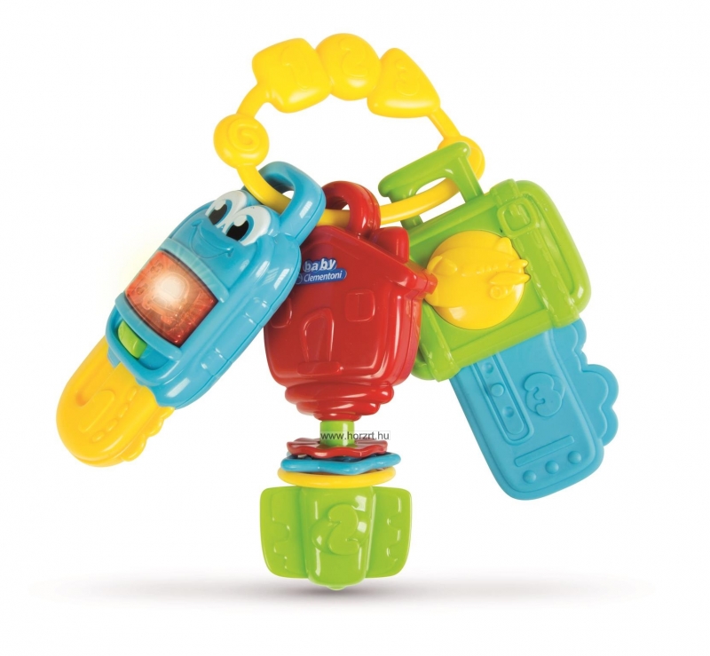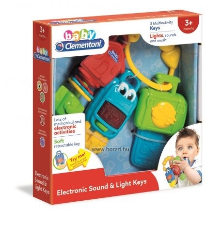 Ez a Clementoni elektromos kulcscsomó három kulcsot tartalmaz, melyek hangot, illetve dallamot játszanak le, vagy világítanak.