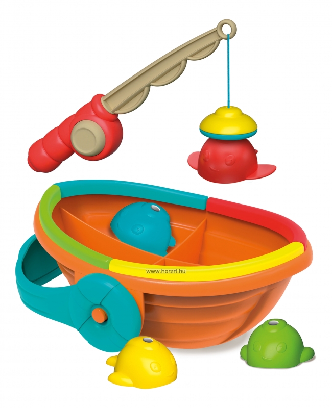 Tartalma: 4 db különböző színű halacska, mágneses horgászbot és egy csónak alakú rekeszes kisvödör.