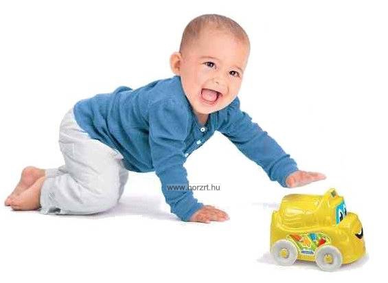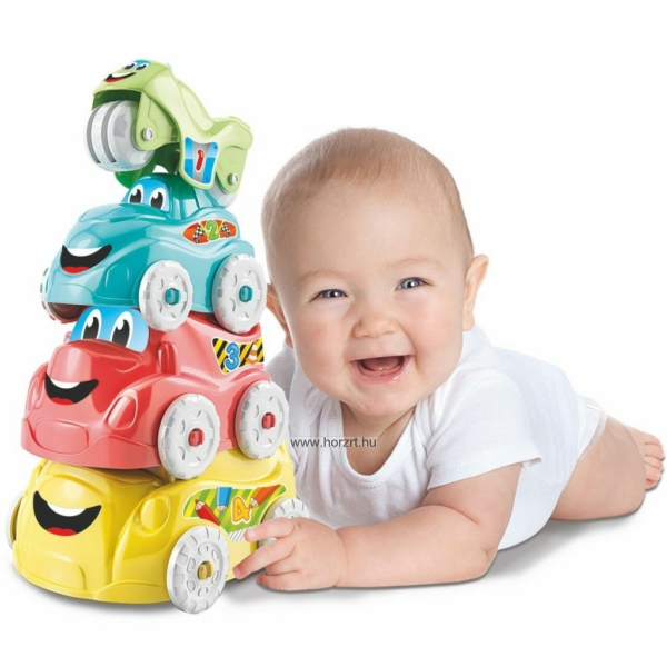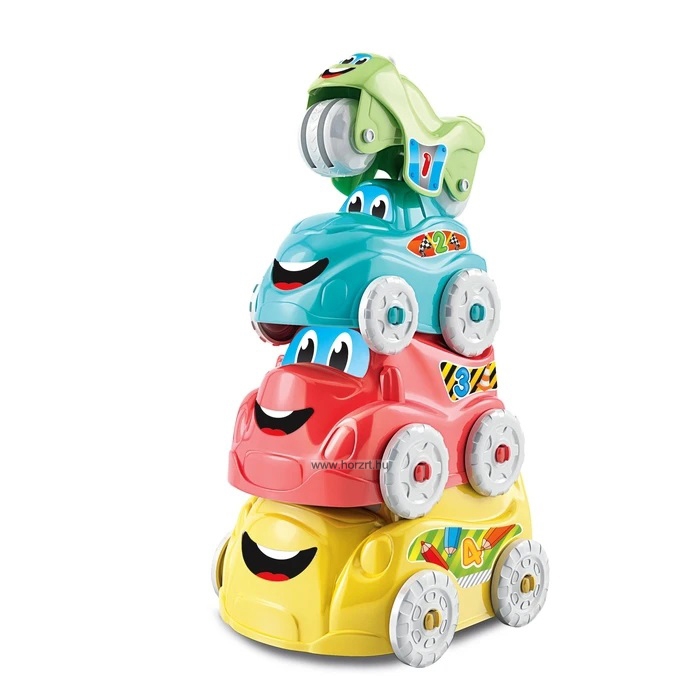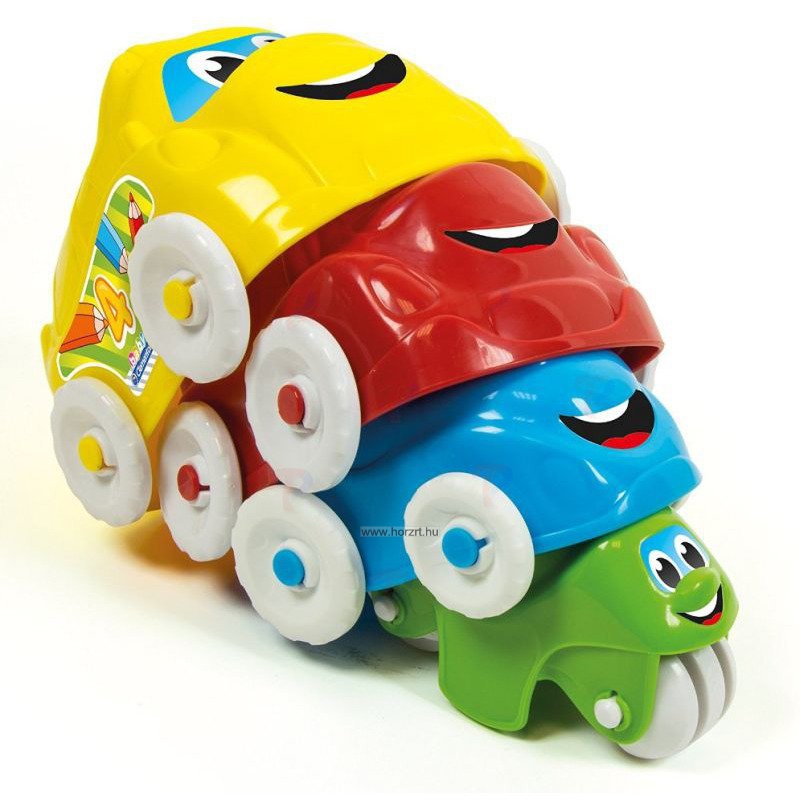Négy barátságos jármű: busz, teherautó, autó és motorkerékpár, amellyel külön külön is lehet játszani vagy egymásra rakva torony is építhető.