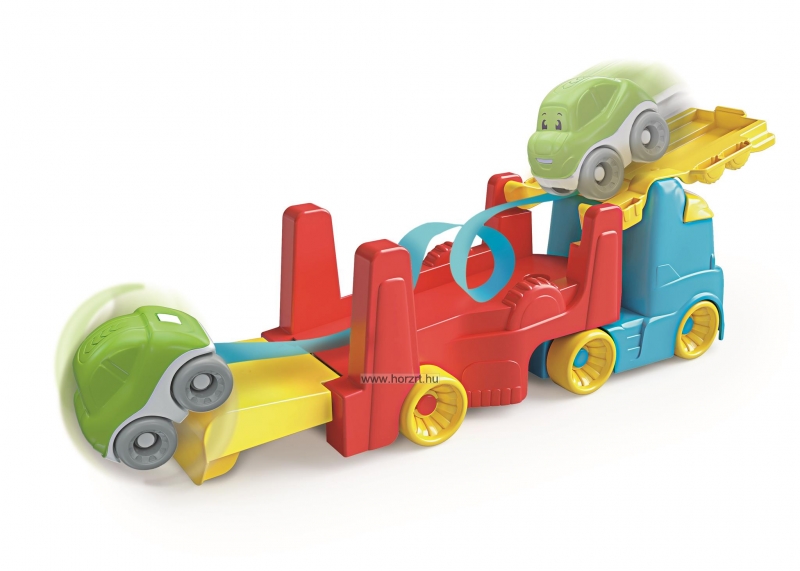 A Clementoni autószállító kamionja nem csak egy egyszerű platós jármű, hanem egy igazi ugrató is.