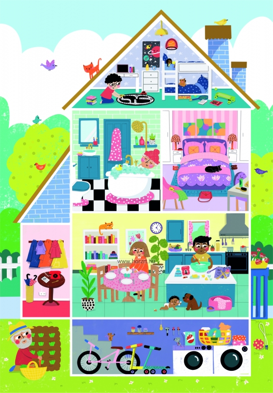 Ez a 104 darabos lenyűgöző puzzle egy teljesen berendezett ház világát tárja elénk, részletesen bemutatva minden helyiséget, a pincétől a padlástérig, valamint a berendezési tárgyakat. Rendkívül részletes megjelenítésű, így nagyszerű módja, hogy a gyerekek játékosan fejlesszék ismereteiket és készségeiket, amelyet segítenek az élethű képek, a kiváló nyomtatás, precíz illeszkedés és a tartós, erős alapanyagok.