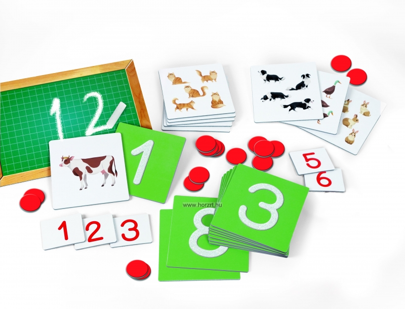 A mennyiségkártyákon háziállatok képei láthatóak, így azok összeszámolása mellett az állatok megismerésében is segíti a gyerekeket. A kártyákon például szerepel kutya, cica, boci, nyuszi, stb. |