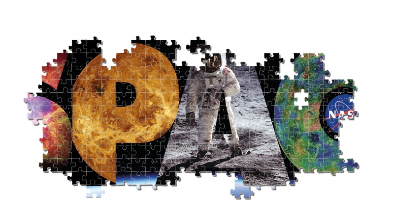 Az óriási panoráma puzzle egy látványos SPACE felirattá rakható ki, melyen egy asztronauta, a NASA logo és különböző bolygók is láthatók.