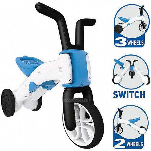 Kezdetben használható 3 kerekű tricikliként, majd egy könnyed mozdulattal átalakítható 2 kerekű futóbiciklivé. Könnyen változtatható szerszámok nélkül is az ülésmagassága 22 vagy 25 cm-es ülésmagasságra. Az ülés kialakítása egyedi, rejt egy kis tároló rekeszt, ahova a kisgyermek elrejtheti a kincseit.