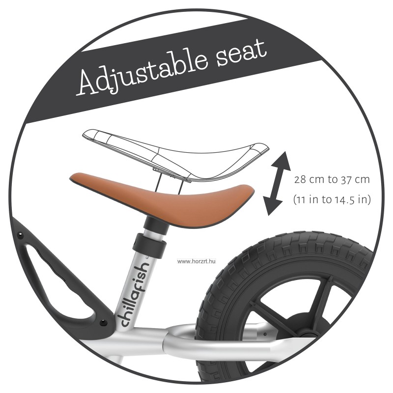 Az ülés magassága 28 cm-37 cm-ig, a kormány pedig 47,6-50,4 cm-re állítható.