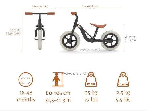 Futóbicikli kicsiknek. Állítható a kormány- és az ülés magassága, hogy kövesse a gyerekek növekedését. A vázba integrált fogantyúval könnyen hordozható. Biztonságos, könnyített fémvázának köszönhetően könnyen irányítható a picik számára. Rugalmas, tömör kerekei EVA anyagból készültek. Az üléssel megegyező színű, csúszásmentes fogantyú van a kormányon. Fejleszti az egyensúlyérzéket, a későbbi, pedállal hajtott kerékpározáshoz.