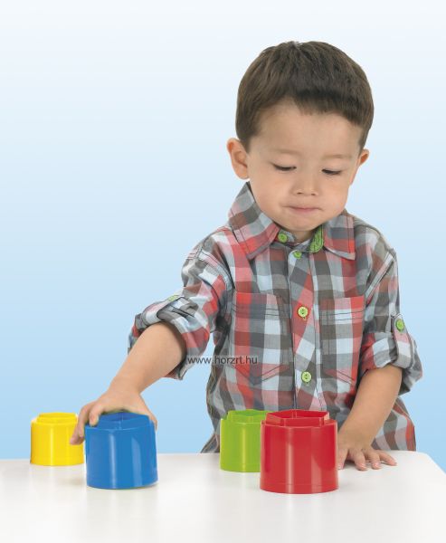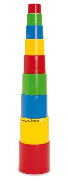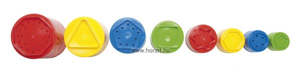 9 db eltérő méretű és különböző formanyomó mintázatú hordó. A kicsiknek a torony felépítésénél figyelembe kell venni a méretek közötti különbséget, és meg kell találni az egyensúlyi helyzetet. Az elemek egymásba is csúsztathatóak.